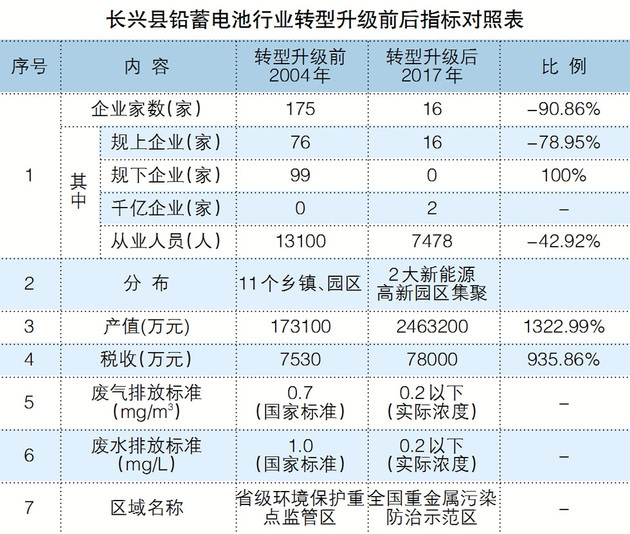 長興縣政府給記者提供的數據顯示,轉型升級前的2004年,長興鉛蓄電池企業數175家,其中規模以上企業76家,總產值17.31億元,稅收7500萬元;轉型升級后的2017年,長興鉛蓄電池企業16家,全部是規模以上企業,總產值246.32億元,稅收7.8億元。2017年與2004年相比,產值增加超過13倍,稅收增長超過9倍。